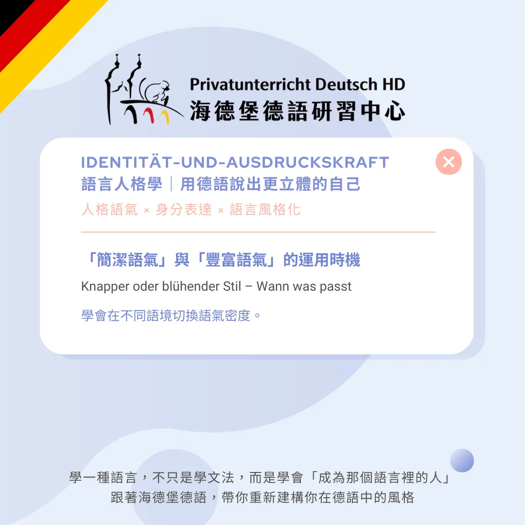 語氣風格不只存在於句型與單字,更存在於聲音、節奏與身體感受中。本篇帶你用「五感法」重新理解德語語氣設計,從聽得見、感覺得到的層面,打造有存在感、有感染力的表達。