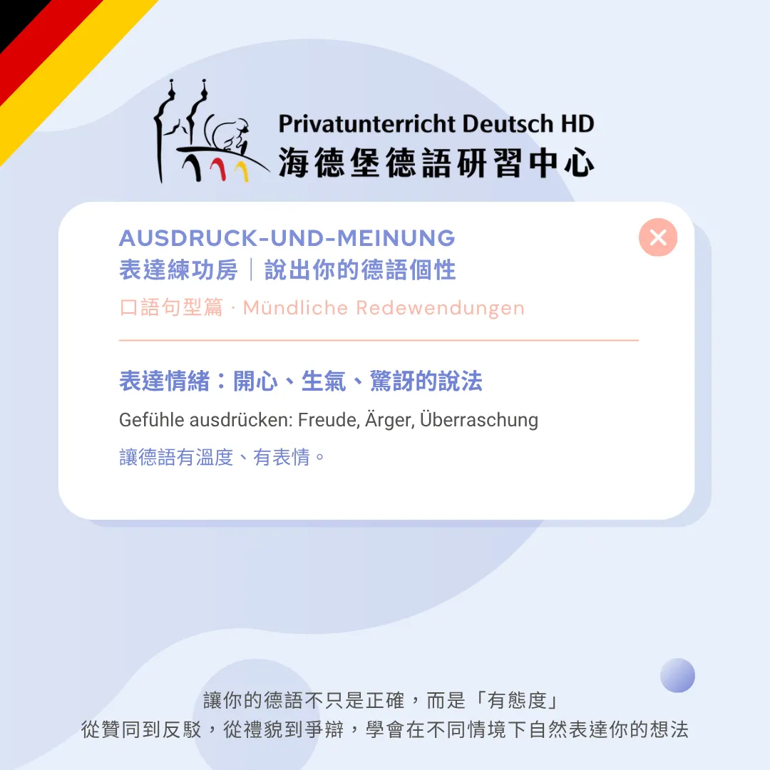 德語不只有 Ich bin glücklich。情緒表達講究「語氣+詞彙+反應」,Celia 老師帶你學會更有表情、有層次的情緒句型,從平淡變豐富、從僵硬變自然。