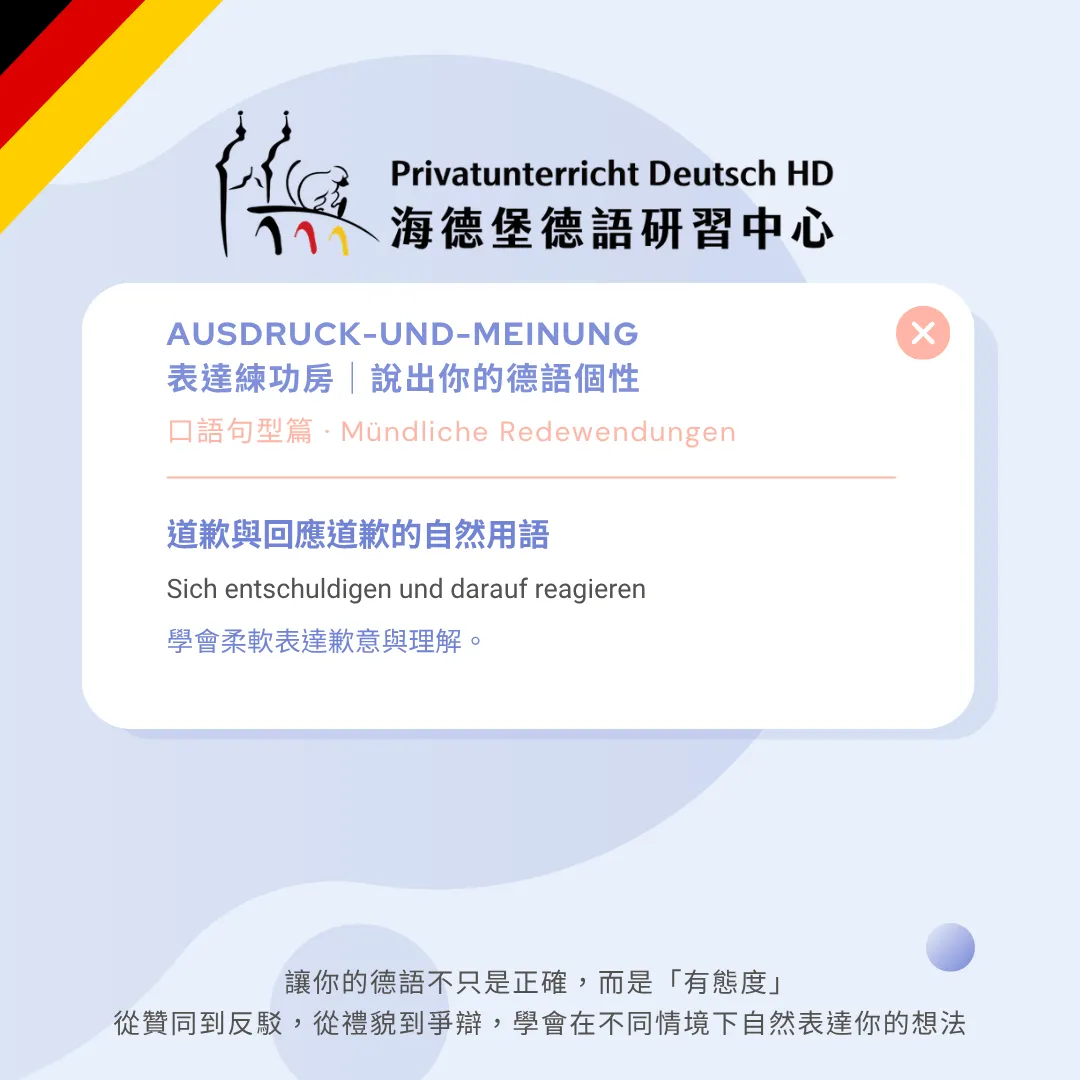 在德語中,道歉不只是一句「Es tut mir leid」,回應對方的歉意更能展現你的語氣素養。Celia 老師教你掌握自然、不僵硬的道歉與回應句型,讓你在人際互動中更得體。