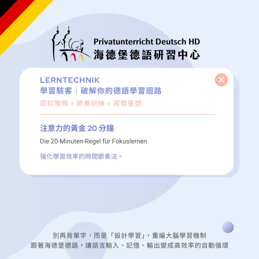 很多人學德語時一坐就想撐一小時,結果注意力快速下滑、效率極低。本篇帶你理解大腦專注力的自然節奏,並教你如何用「黃金 20 分鐘」設計學習單位,讓每一次投入都有效,而不是硬撐。
