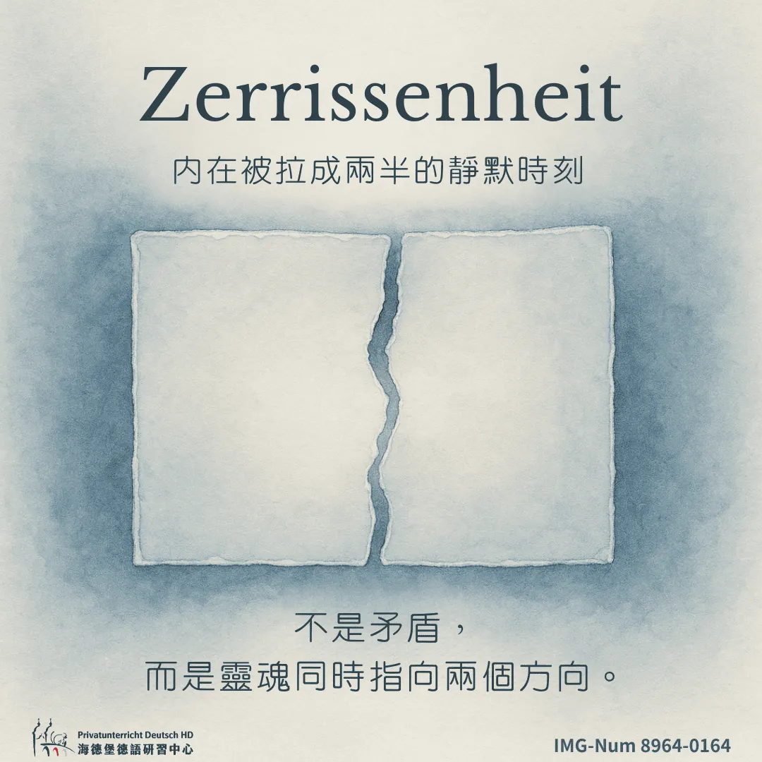 很多中文語彙都能描述糾結:掙扎、矛盾、猶豫… 但它們都不足以捕捉 Zerrissenheit 的重量。 因為它並不是一個「事件」,也不是一條「問題線」。 它是一種存在。 一種你站著,卻彷彿被兩股力量往相反方向拉扯的狀態。